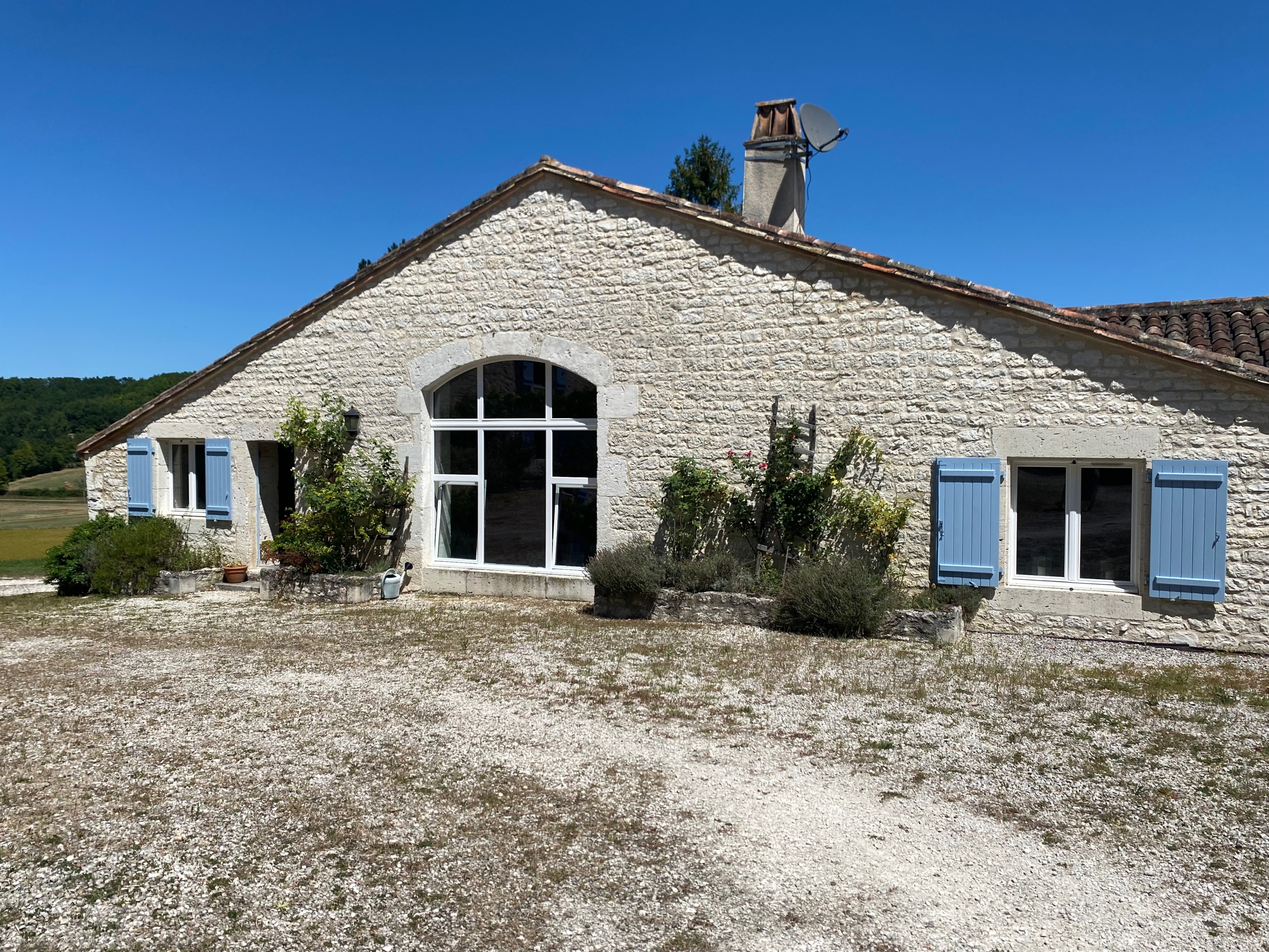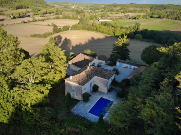 Renovated farmhouse, barn, guest cottage with pool. A stunning ensemble of stone properties featuring a traditional stone farmhouse with three bedrooms, a fully renovated barn with underfloor heating, a charming guest cottage, a swimming pool, and an open barn for parking—set on approx 5,000 m2 of gardens and approx 2 hectares of pasture next to the property. The woodland behind is approx 10 hectares but essentially looks after itself . Nestled on an elevated position just minutes from Montaigu-de-Quercy, the property offers sweeping views and complete privacy.
